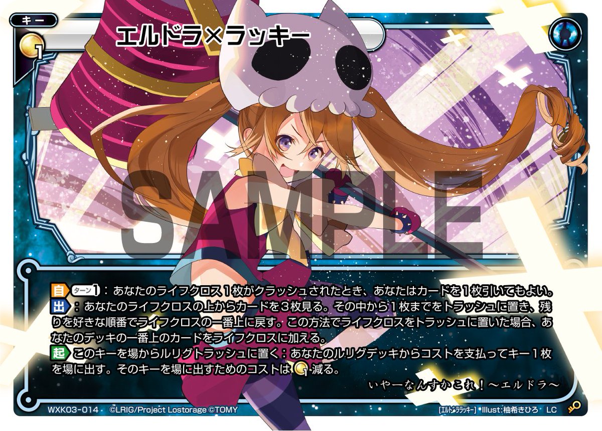 — WIXOSS公式アカウント(@wixoss_TCG)Fri Jul 27 04:57:27 +0000 2018《エルドラ×ラッキー》の一番上の能力はターン1回になった初代エルドラレベル4の能力ですね~、2番目の能力でライフバーストの質を上げれるのは強そう。さらに自主退場もできるので色々なデッキで使われそうですね!