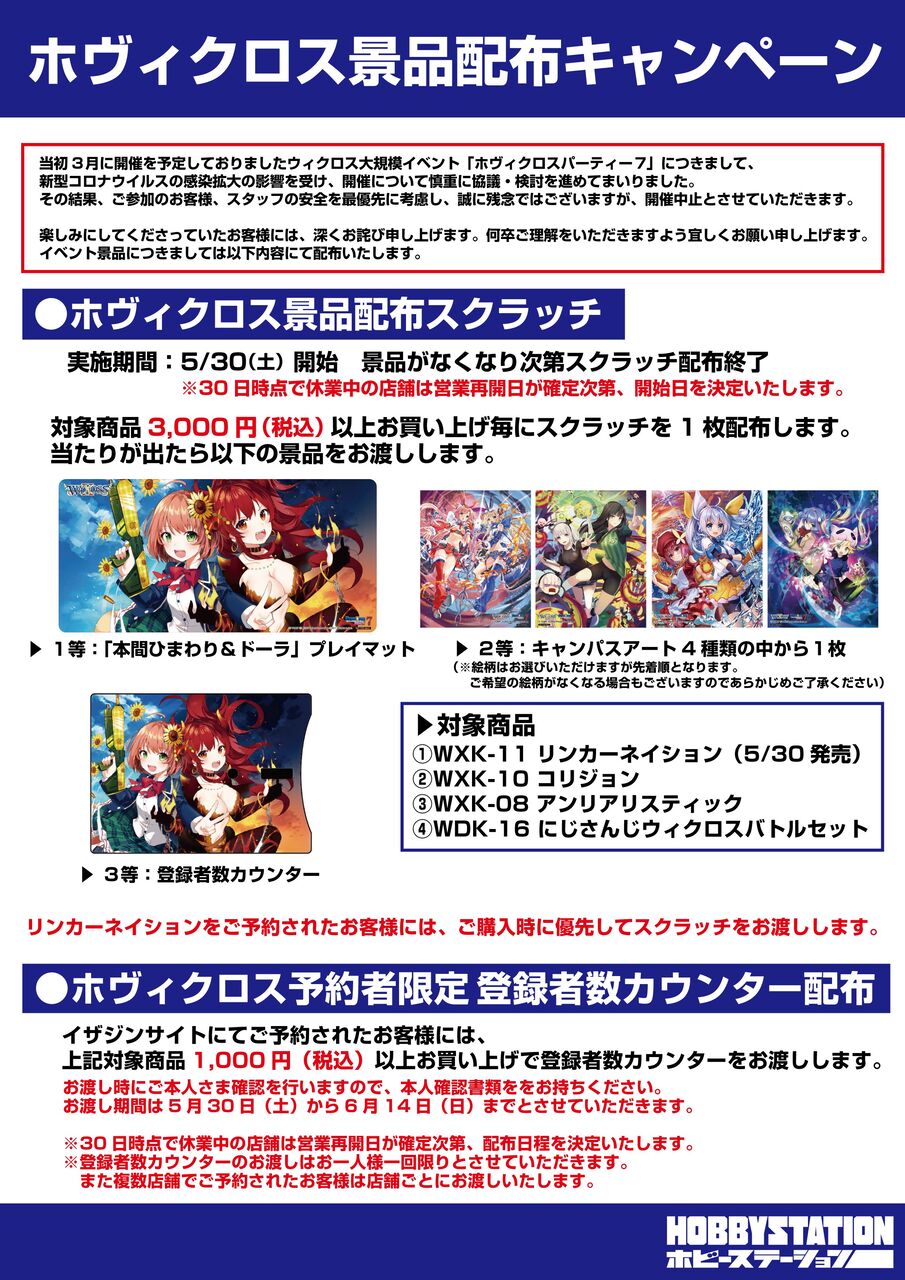— ホビーステーション@イベント案内(@hbst_event)Thu May 21 02:19:46 +0000 2020ホヴィクロス景品配布キャンペーン
