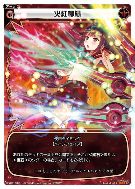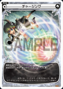 ニエの不定期カードレビュー第1弾《チャージング》 2014年06月14日 カテゴリ:ニエのカードレビュー 少し前までカードレビューをまとめてましたが、他のブログ様もやっているので、 私、管理人ニエが面白い!とか使えそう!などと思ったカードを紹介して行くことにしました 今回紹介するのは、フォロワーさんから教えて頂いた便利な【無色】の【アーツ】である 《チャージング》です カード種類:【アーツ】 コスト:【無×0】 使用タイミング:【メインフェイズ】 テキスト:【あなたのデッキの一番上のカードをエナゾーンに置く。】 第1弾ブースターパックのLC(ルリグコモン)です ノーコストで使えるアーツなので、アーツの枠が余ってしまった時などに入れるのも良いですし 速攻を仕掛けるデッキにも入る、とても使いやすくて便利なカードです 低レアリティのカードですので第1弾が安定供給されるようになれば、1枚100円以下で買えるようになると思います (6月14日現在は300円以上で売ってる店が多いです)